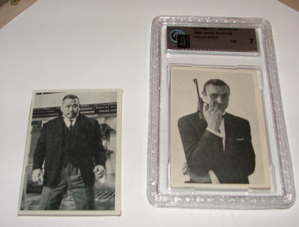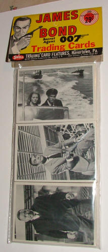 Swell rack pack of James Bond Trading cards. This is a hard piece to get and there are many faked up sets. There is a colour header card which is stapled to a bag, in the bag are 6 cellophane sealed packs each containing 6 cards giving a total of 36 cards. Beware packs that just have loose cards inside. The header card is relatively common as are single cards and it would be worthwhile for a faker to put 36 used cards in a bag with a header, it could be done for around $75 and the retail might be $200+. the sealed cellophane packs are extremely rare and sell for up to $100 each yet an original set like the one pictured and described here might sell for $400 so originals may be broken down for profit, strange situation!! |