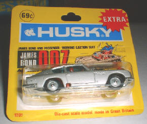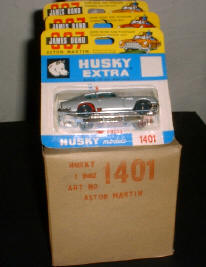 Here are a few variations on the husky Aston Martin. No.s 1001 were U.K cars. 1401 for the European Market and 1201 for the U.S. market. Either red or brown interiors with matching ejector passenger. The ones with diecast wheels are officially EXTRA versions and these were sold at a higher price although as can be seen top left these made there way onto regular cards. |