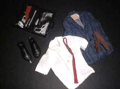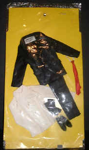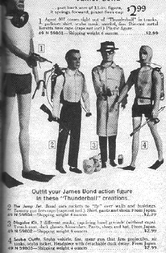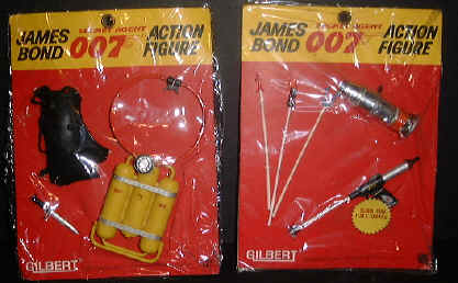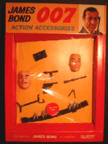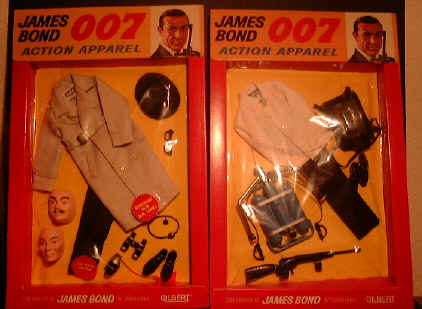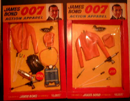 Gilberts range of doll accessories I often wonder how many kids actually played hard and long with their Bond doll. Not only are they pretty boring but the clothes and accessories are hard to get on the doll. Seen here are the complete set of accessories that were generally available. There is mention of others in early Sears catalogs and the dinner suit below is one of those. Interesting to note that I have never seen a dinner suit in a frame box. I have also come to believe that the suits above were also so through the Sears catalog and may have been delivered without frame boxes. The loose outfit on the right came with the first version of the Gilbert James Bond doll, which was only available through the 1965 Sears catalog. There are a pair of shoes, one of which has a spring loaded knife, suitcase with gun (later available on an action toy card), a blue striped business suit, white shirt, tie and brown socks.