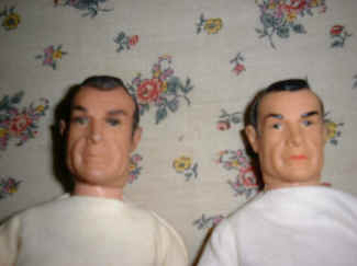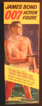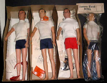 GILBERT JAMES BOND DOLL The start of many a James Bond collection. Introduced in 1965 in the Sears Christmas Wish book this is one of the most popular items in any 007 collection. Not quite as simple as getting one though as there are many variants. 1st version is boxed doll sold only through Sears, I have a copy of the box but as I have never seen a real one I cannot be certain that it is authentic, I do have most of the outfit and this can be seen on the doll accessories page. Seen above are three versions of the regular boxed doll, the box lid is shown on the right. Two completely different body styles and heads are available, one manufactured by IDEAL and the other by GILBERT, both were sold as GILBERT items. All had shorts