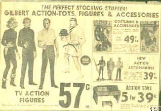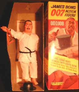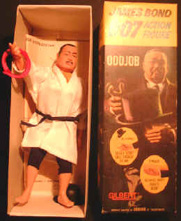GILBERT ODD JOB Well once you have an James Bond then you definitely need an Odd Job! Launched again in 1965 this version has rumors of a Sears only special but I have never seen this either. 1st Version here is the black Box at the top. Doll has wide legs stance and one karate chopping arm and one hat throwing arm. Outfit consists of a two piece wrap with sewn in yellow neckpiece and black belt. He has tight knee length brown pants. Head band wraps once round the head and is finished off wit ha plastic bowler, this last item he can throw.