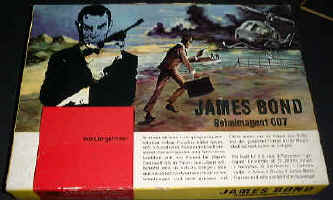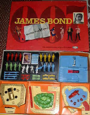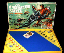 Triang 007 Underwater Game Spectacular and definately the most impressive Bond game ever produced. Set includes Bond and eight orange frogmen. Six sharks, Largo and eight black frogmen, bomb sled, 25 stands and two dice, one extremely large and heavy board and the instructions are on the reverse of the box lid.