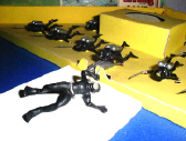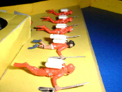 Seen here is a line of orange frogmen with Bond. He is a different figure to the rest, hand painted and with a jet propulsion pack on his airtanks, note the very delicate harpoon guns they all carry |
