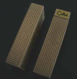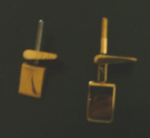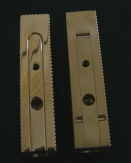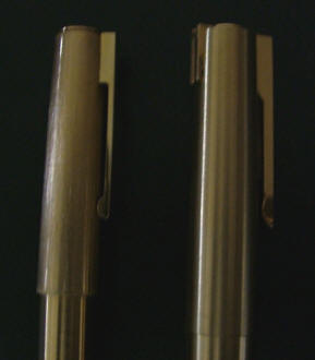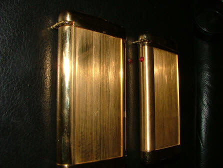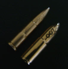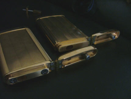 lists. Most sought after is the Golden Gun, this is fashioned after the weapon used by Scaramanga (Christopher Lee) it is a gold plated gun that when broken down becomes a cufflink, pen, lighter and cigarette case. These items are larger than life as the gun would ultimately look a bit small. The original item considered for the film was manufactured by Colibri and had magnetic fit parts, this proved too fragile and another was quickly knocked up in house. It is this gun that was used in the movie and has been copied by SD Studios. There are many variations of this gun as improvements were made along its production. Originally it was a limited edition of 7500 but it has been estimated that the production was probably less than 1000. In these pictures the earlier gun is on the left and the later on the right. The main differences are two completely different guns, the earlier one being around 5% smaller. The lighter on this gun has no Colibri label and no attempt has been made to give the appearance of a lid. The Cigarette case has no ruby on the early version and the locking mechanism includes a spring loaded clip to hold the lighter in place. The cufflink is a crude affair on the early gun with a bare thread and this screws to the case only and does not secure the lighter as in later models. The pen on the early model has a lid with superior finish but has the wrong pen clip, the bullet is also longer and the engraving is not painted in |